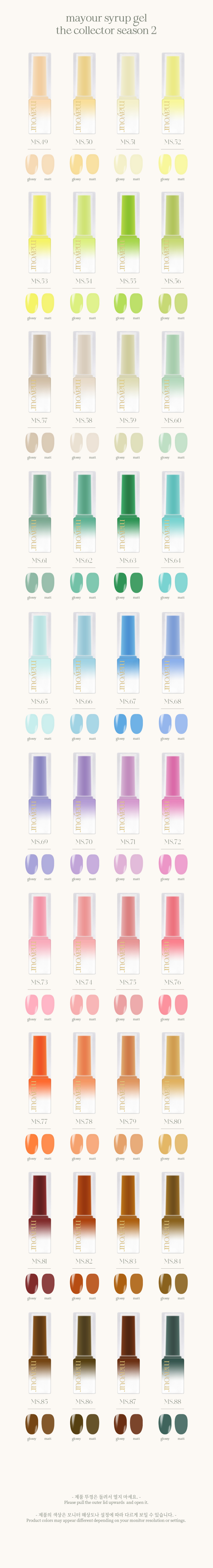 The 'Collector Season 2' Single collection by Mayyour is a tribute to the professional artist who seeks deeper, more emotional color palettes. This series moves beyond basic tints, offering high-clarity syrup gels with a sophisticated depth that remains crystal clear even after multiple layers. Formulated with premium professional resins, each single gel ensures effortless self-leveling and a streak-free, mirror-like finish. Designed to capture the changing light of the seasons, these shades are the definitive choice for 'Blush Nails,' moody gradients, and high-end minimal art. Experience the refined elegance favored by Seoul’s most prestigious studios to build a collection that defines your unique artistic voice.